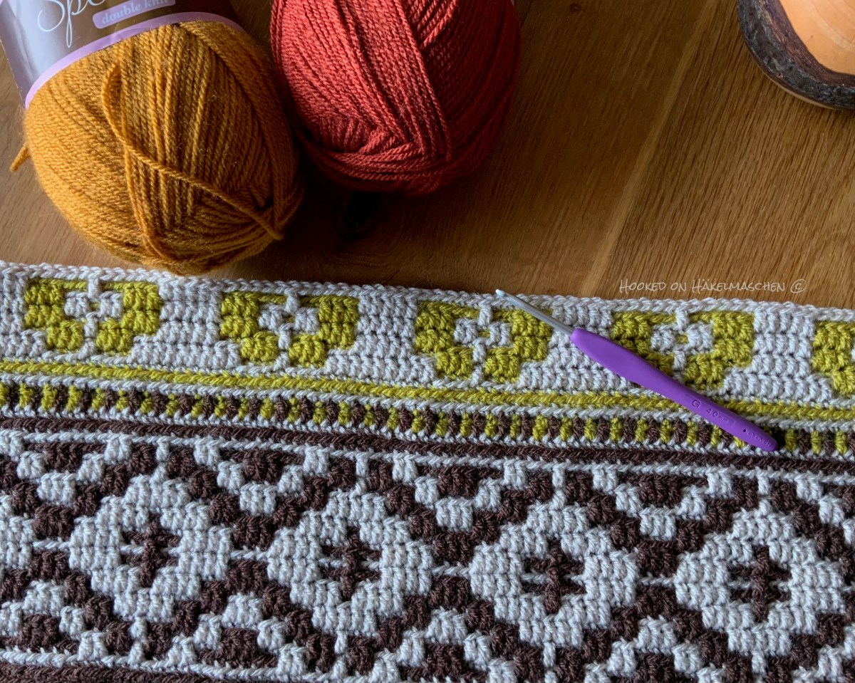I fell in love with this blanket the first time I saw it and had to get the pattern. I like these autumn colors she used and so I will make it in the original color scheme. But it also will look great in other colors. Meanwhile I have seen it in many different shades and another favorite of mine is a two colored version in pastel tones.