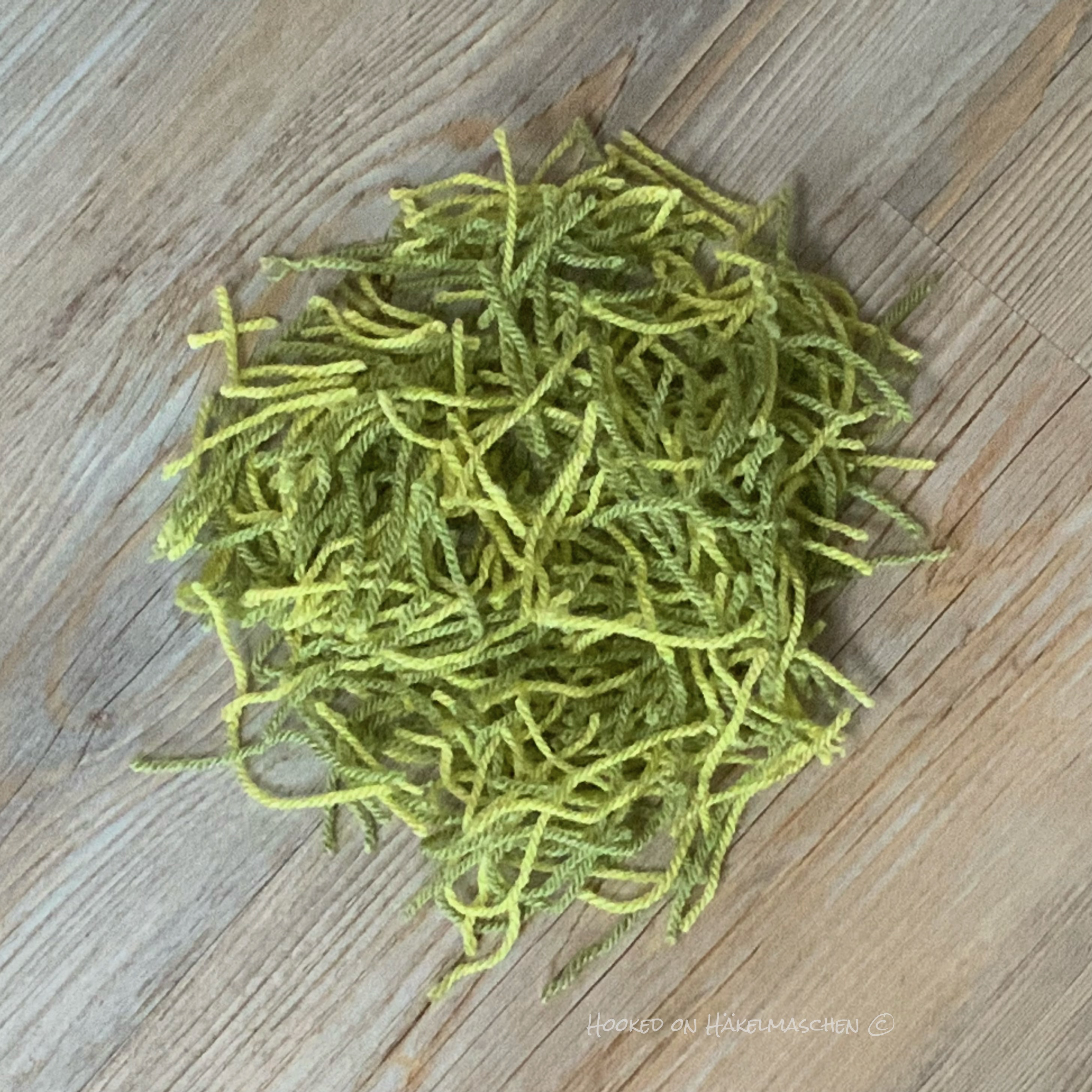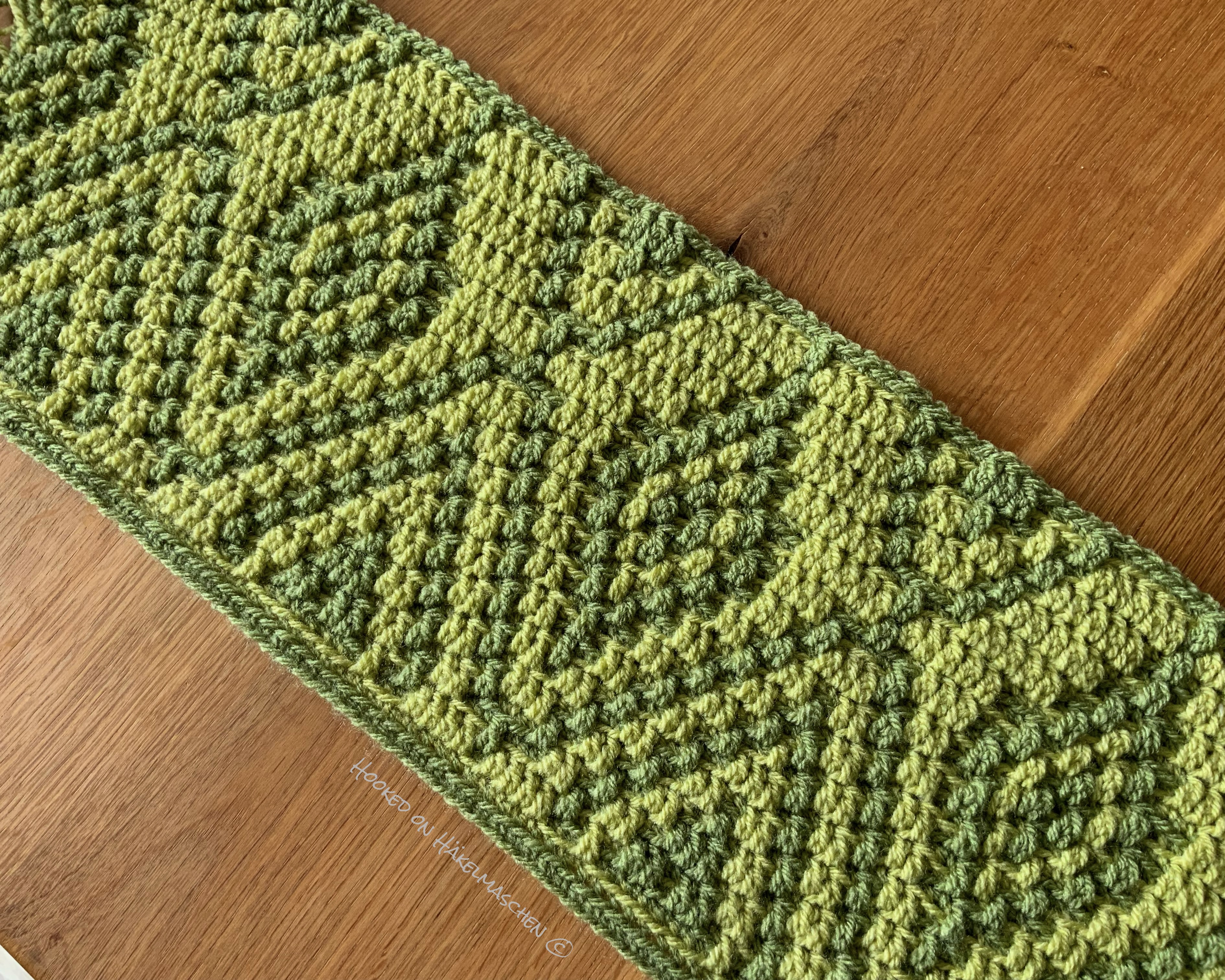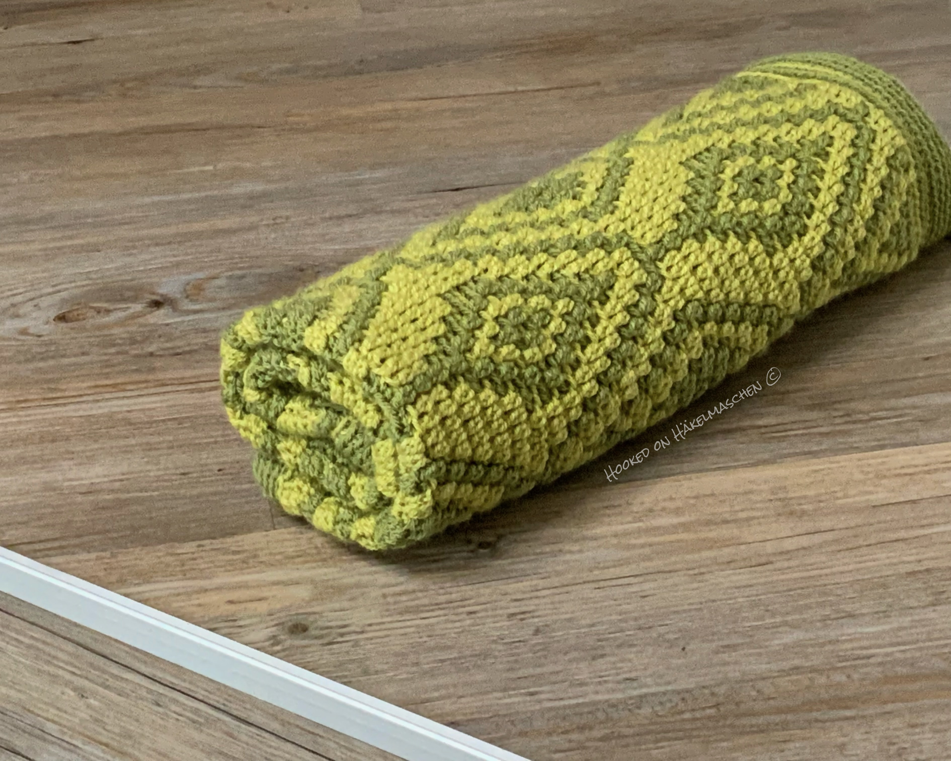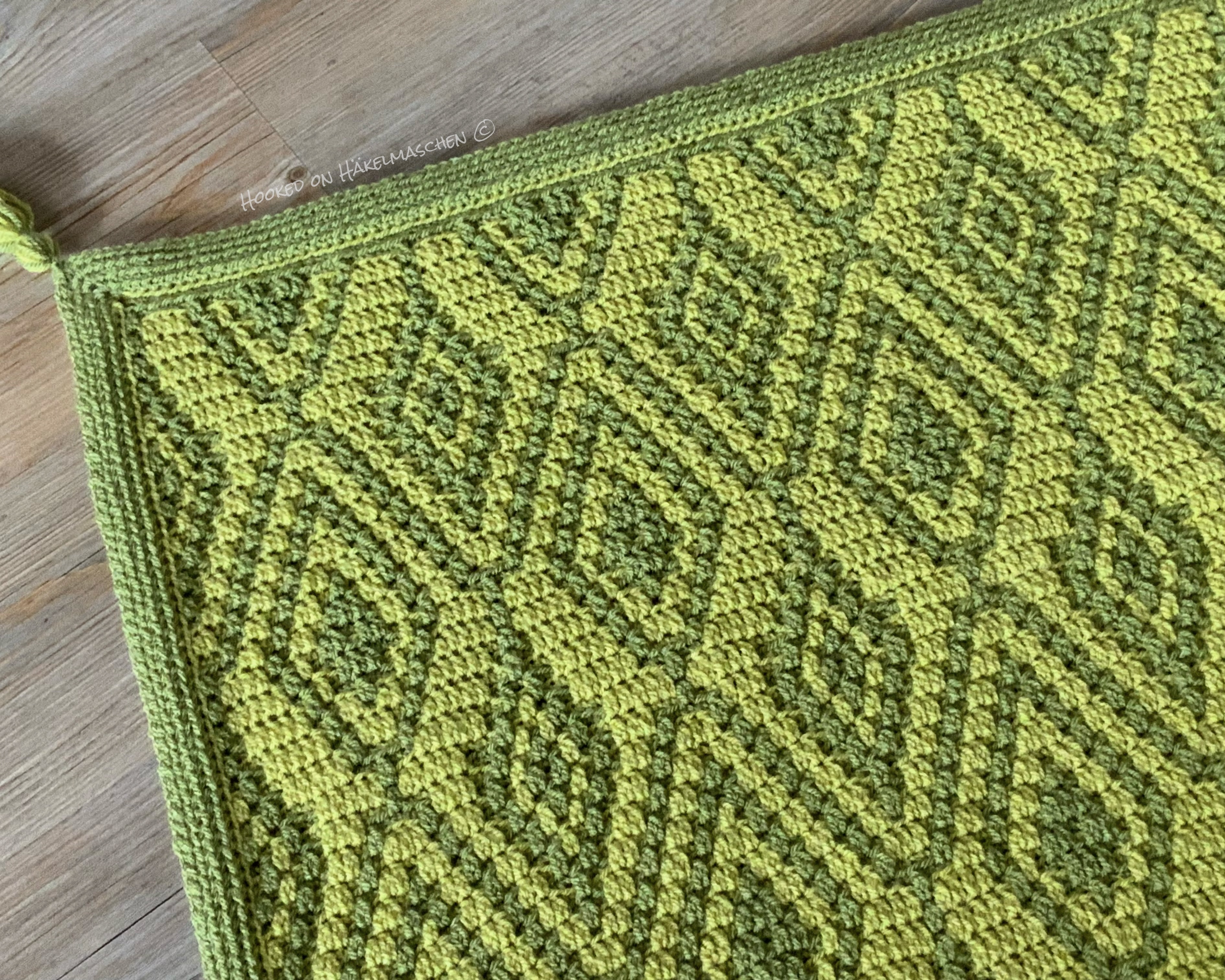 Following the pattern, the complete border should be done in color C1. I was a bit afraid of running out of Meadow, so I decided to do the back layer of the border in Pistachio and only the front layer in Meadow. My slip stitch round for the border is done in Pistachio.