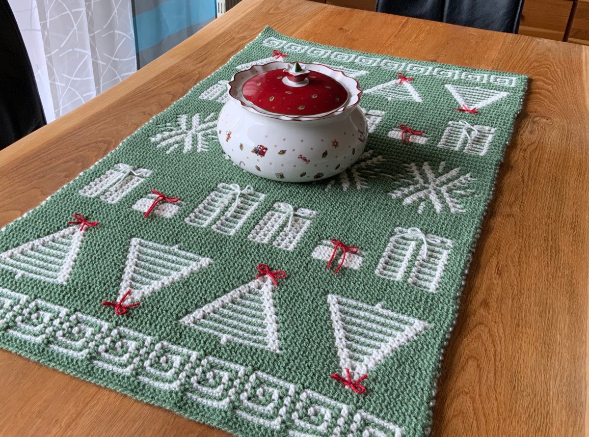 was my second pattern in Overlay Mosaic. My first one was a placemat made with Chevron Apache Waves.I already mentioned it in this post. Mosaic Christmas is a pattern designed by BebaBlanket. It has charts for 4 different motifs, Christmas Trees, Snowflakes, gifts and an ornament that can be used as a separation.The main repeat goes over 45 stitches so the size is easily adjustable and you can create a lot of different items.