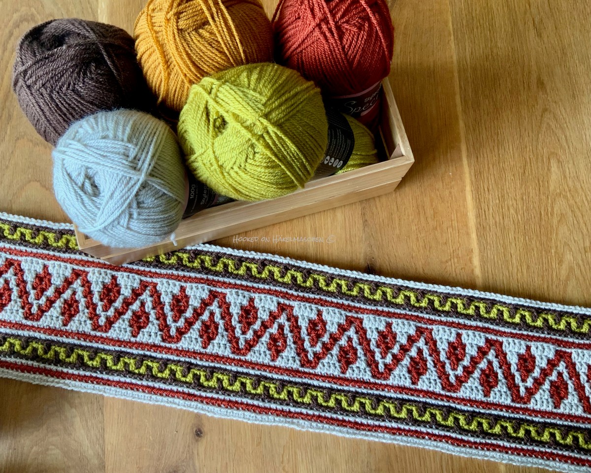 I used Stylecraft Special DK in the colours Parchment, Walnut, Copper and Gold. I had to replace Lime with the colour Nijmegen from Scheepjes Colour Crafter. Lime was not available at that time but Nijmegen should be the same tone.