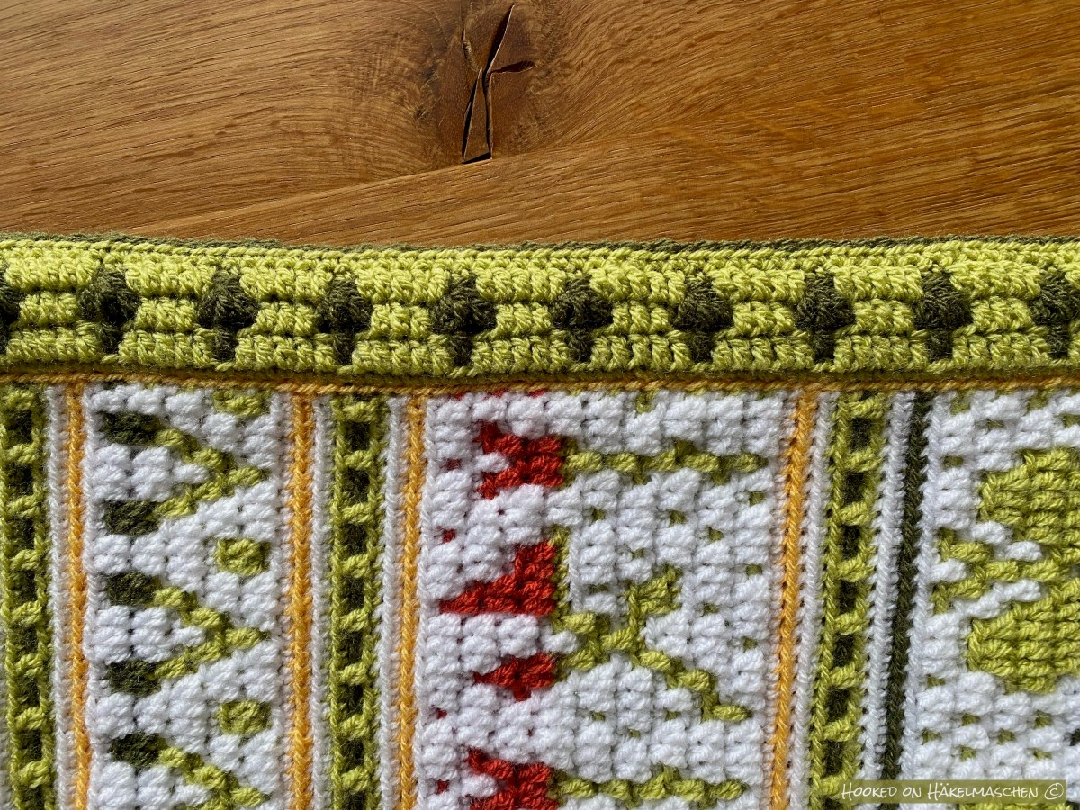 I worked the border as normal. In the final joining round I left a piece open on the upper side edges. On the last 7 stitches on both upper sides I worked the slip stitches only on the front layer without joining the two layers. The corner is worked as normal.