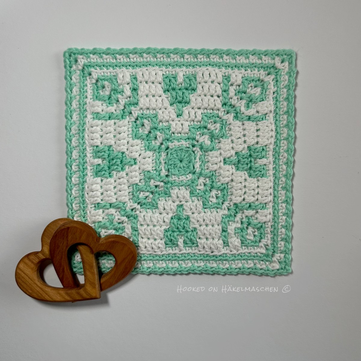 As I only made a single square, I reduced the border a little and crocheted only two rounds. I used rounds 1 and 2 of Ana‘s border: round 1 in White and round 2 in Mint.