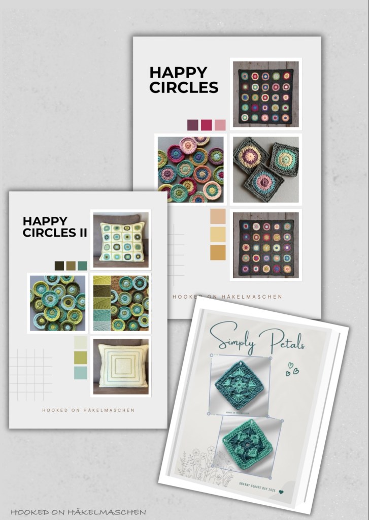 Last but not least I published the Simply Petals pattern. This little square was my contribution to the Granny Square Day 2025. There are certainly many different ways in which it can be used. Last year, I started making a cushion out of it. Regrettably, the project was never completed. Having finished all the squares for the front, I wasn’t satisfied with the colour choices at all. Now they are gathering dust in my craft basket, waiting for a new use.