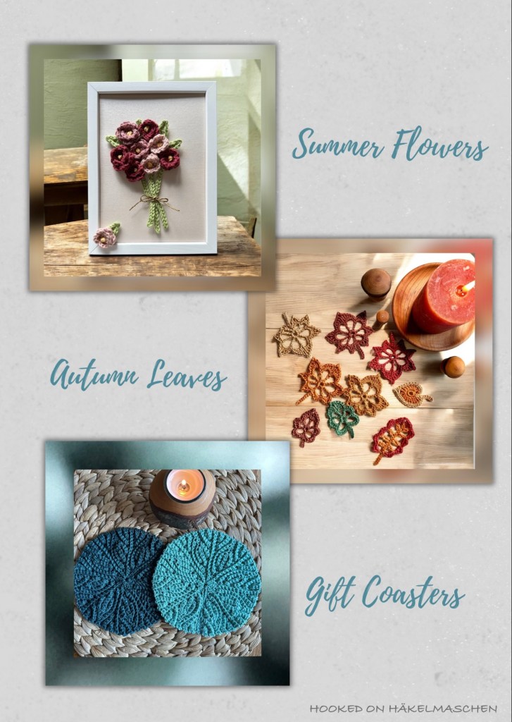 And I finally managed to try out some patterns from a book that I had on my shelf – äh, Kindle – for quite a while: Crochet Collage Garden by Chris Norrington. As the name suggests, the book features a lot of beautiful collages made with flowers and leaves. You can read all about the autumnal leaves I made in this post.