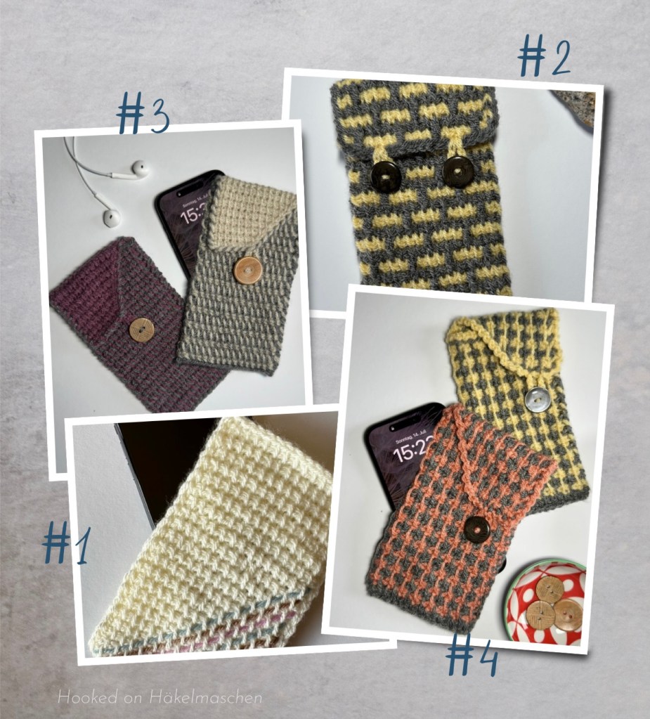 The results are 4 different mobile phone covers for my iPhone that I would like to show you here. I will write down the patterns one by one, so that you can make one for yourself if you like.