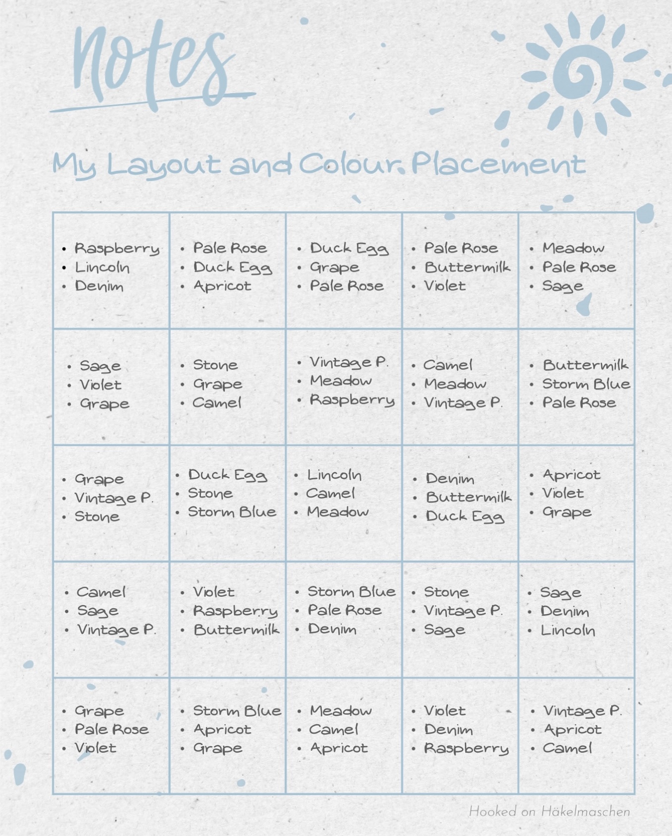 I started my „experiment” by putting together 15 different colours – mostly leftovers. All 15 looked good together. However, I personally wouldn’t place some colours right next to each other. For example, Camel and Vintage Peach or Sage and Meadow.