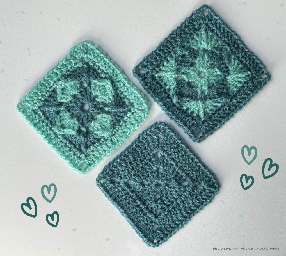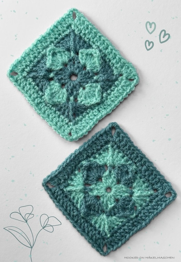 Each square is worked in 5 rounds and has 15 stitches per side, making it easy to combine with a simple, plain square in double crochet.