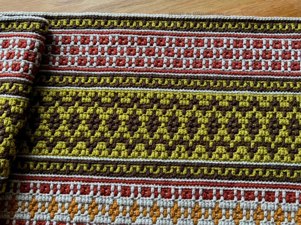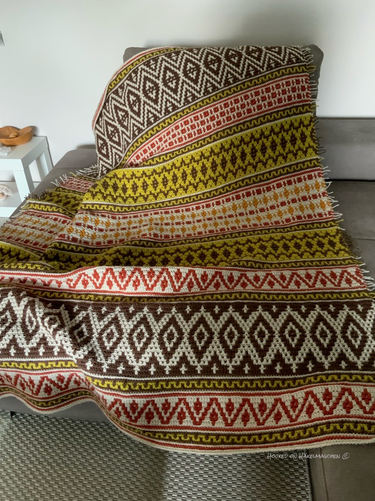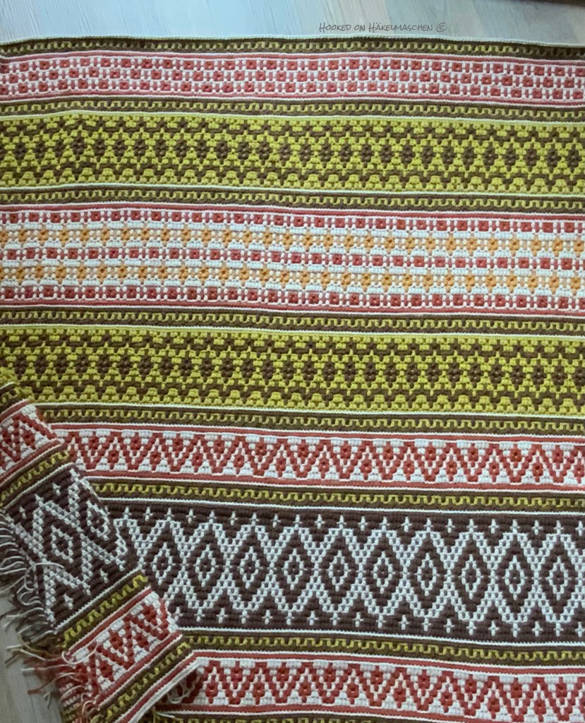 This also was the reason that I switched to the so-called inset mosaic. You don’t have to handle all the yarn ends there. But of course you also need a border for inset mosaic. The first pattern I worked on didn’t suggest a border, and I had no idea what I could do myself. In my search for inspiration, I came across a double border that works without slip stitches and is based solely on front post double crochet. I just gave it a try and the result was quite nice. The border gave the blanket a nice drape. It is probably an acceptable alternative to the classic double border. But I don’t think the front post dc do go with every pattern.