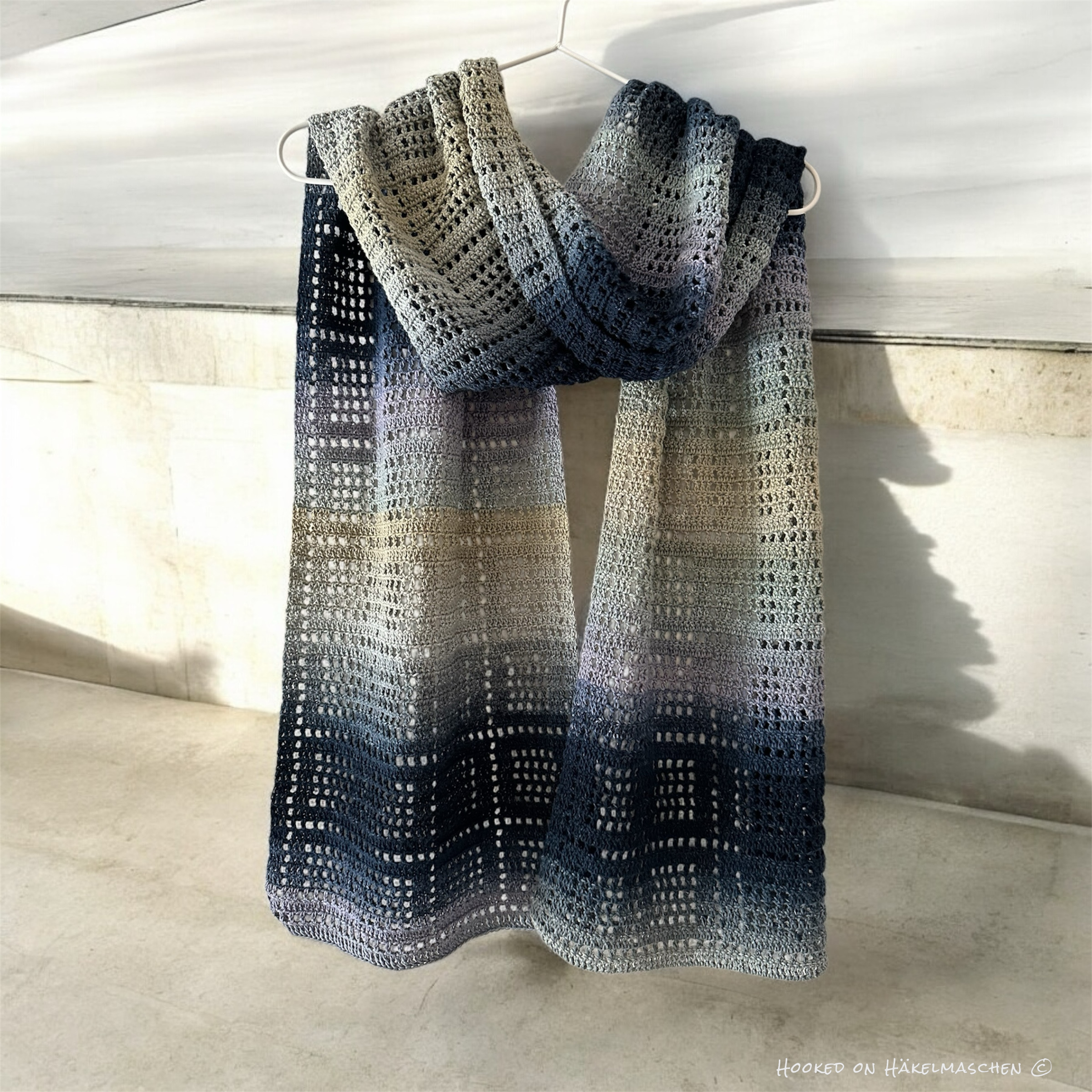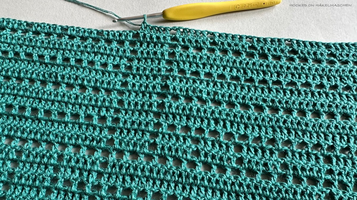 And, last but not least: Filet crochet looks best in a solid colour. A colour changing yarn with longer changes also works but a variegated or sprinkled yarn might distort the pattern. So be careful in choosing colours.