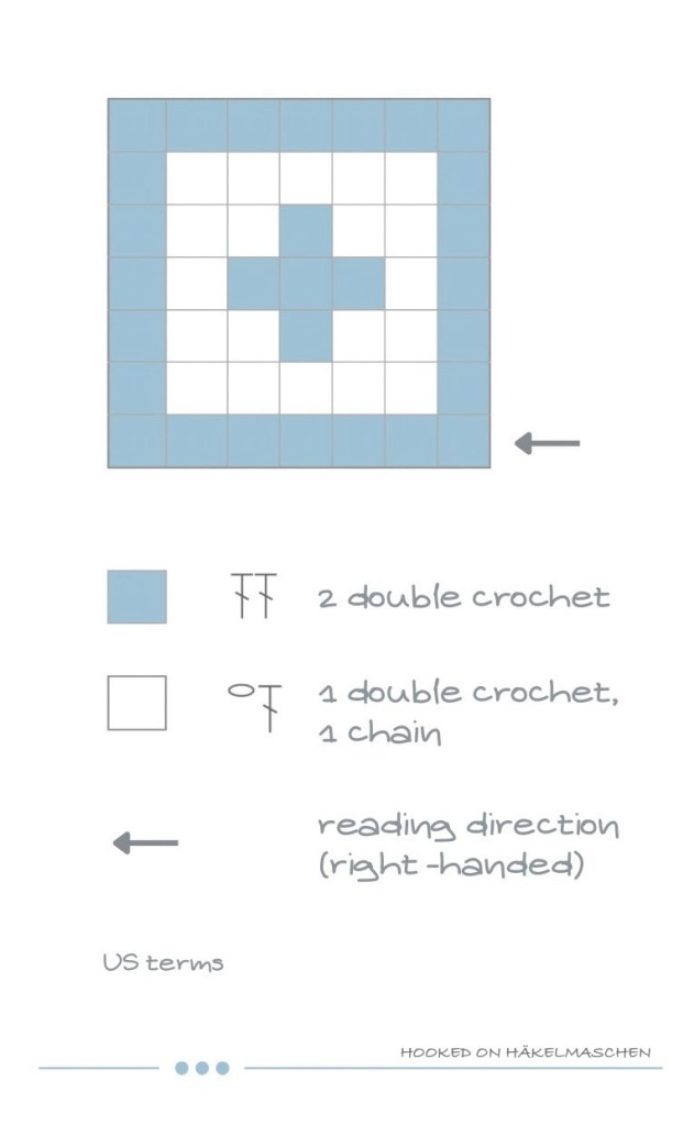 As said above, filet patterns are only worked with double crochet and chains. Each box of the pattern grid represents a certain number of stitches and stitch combinations. One row of the pattern grid stands for one row in your workpiece.