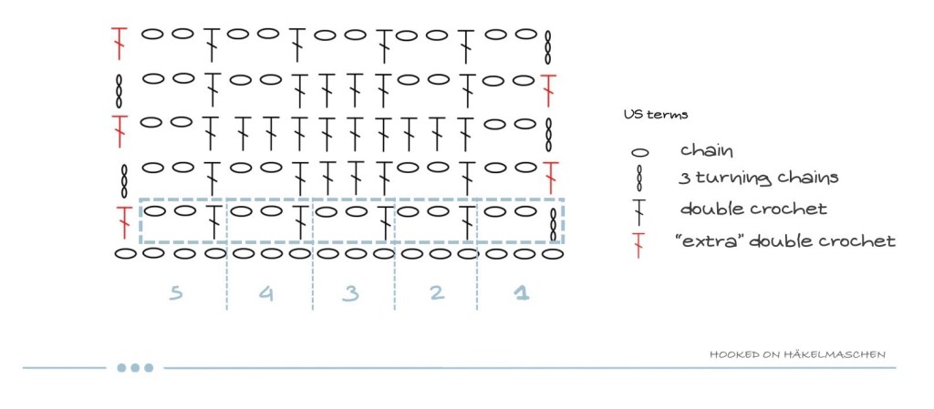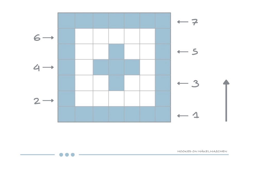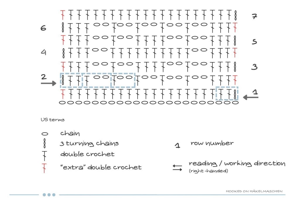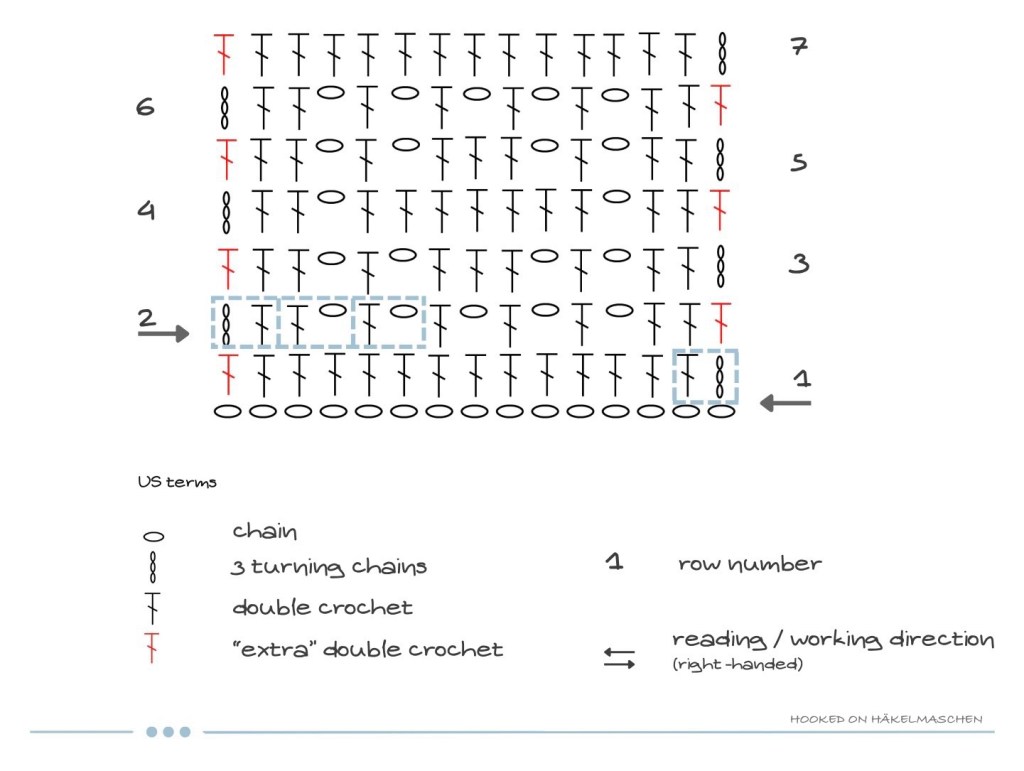 For a better understanding, I have marked the single ‘boxes’ of the fillet diagram in the chart with the crochet symbols. This clearly shows the function of the ‘extra’ stitch.