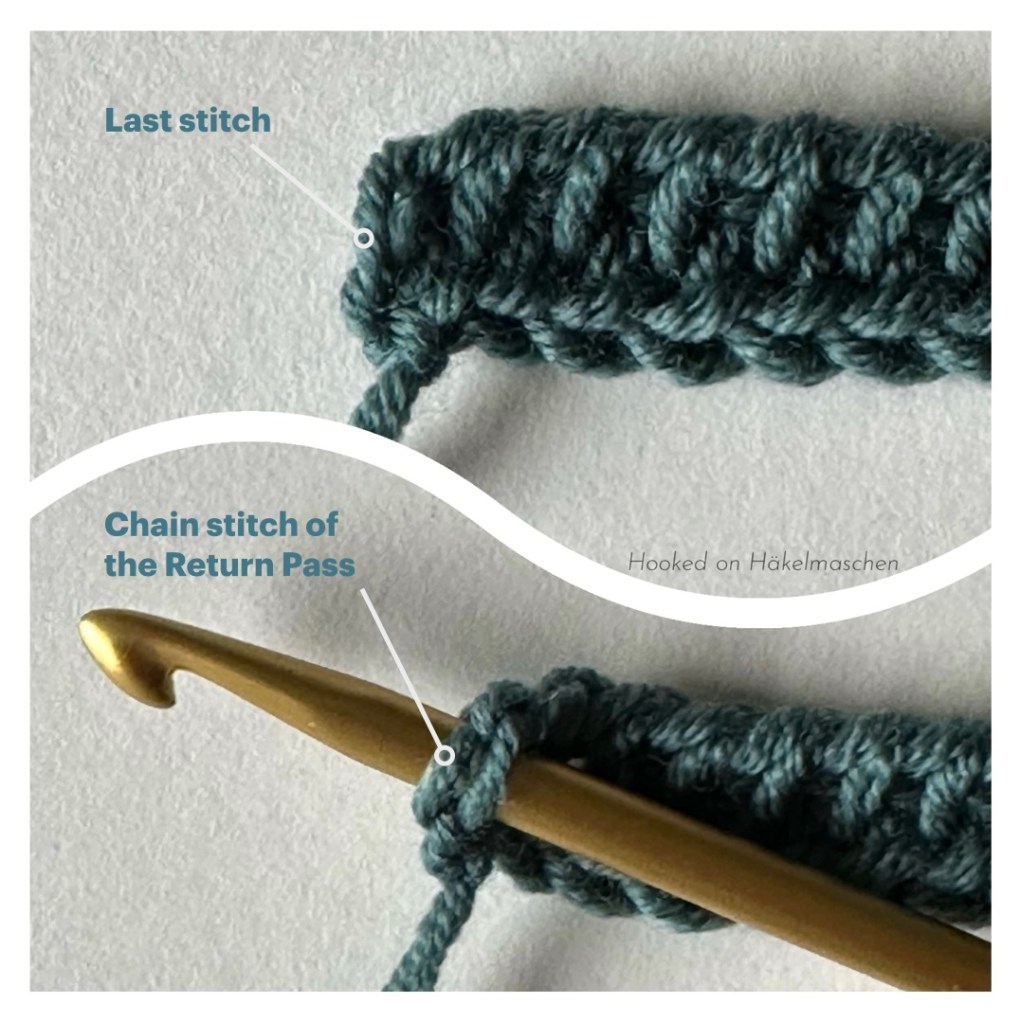 The last stitch of the forward pass is worked in the stitch that is equal to the first stitch of the return pass of the previous row – the one created by pulling the yarn through 1 loop (chain 1) when starting the return pass. So it looks a bit different and there are different ways to work it.