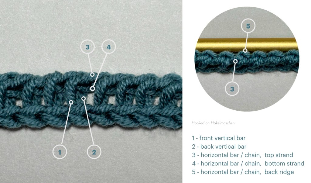 The horizontal bars are created by the chains that are worked in the return pass. They either are called horizontal chains or horizontal bars. They consist of the top strand of the horizontal chain (top horizontal bar) the or bottom strand of the horizontal chain (bottom horizontal bar) and the or back ridge (or back bump) of the horizontal chain (back horizontal bar).