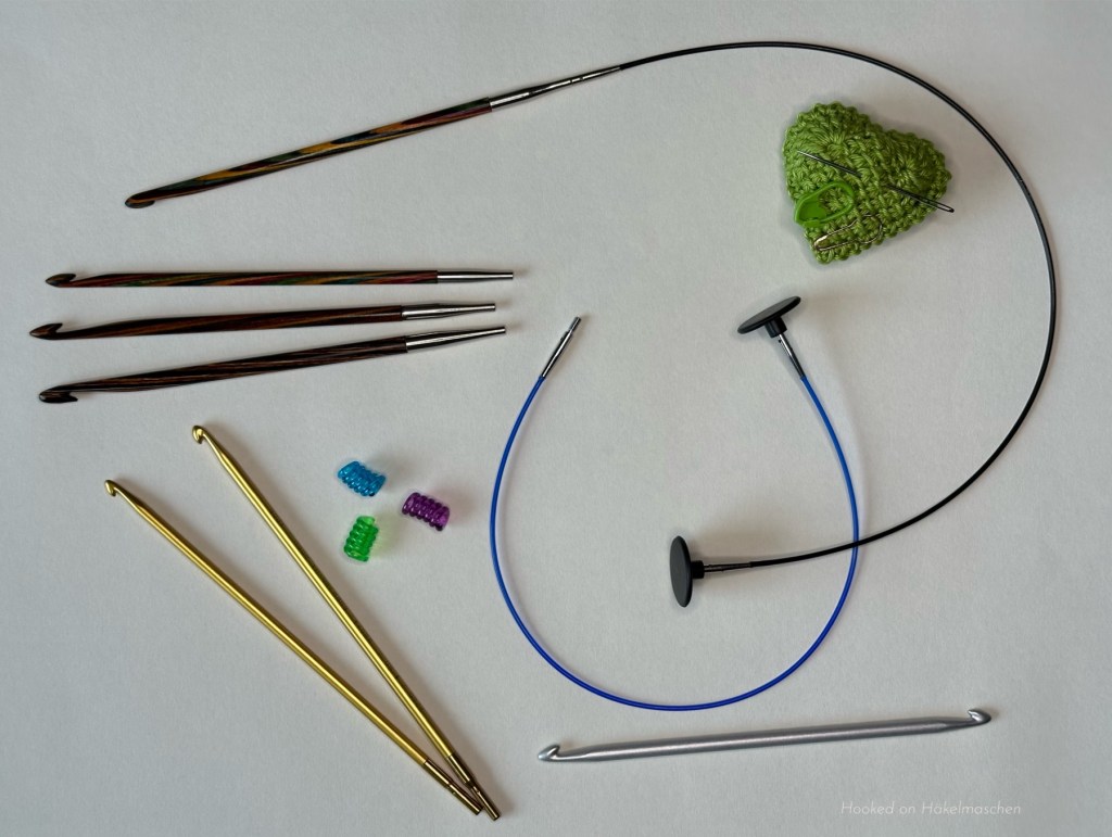 I started with some Knit Pro Symfonie Hooks with attachable cables in different lengths. And I just got myself some Addi hooks where you can either attach a stopper or a cable. I don‘t have the stopper yet, but I help myself with a little stopper for double pointed knitting needles. Well, a simple rubber band serves the same purpose.