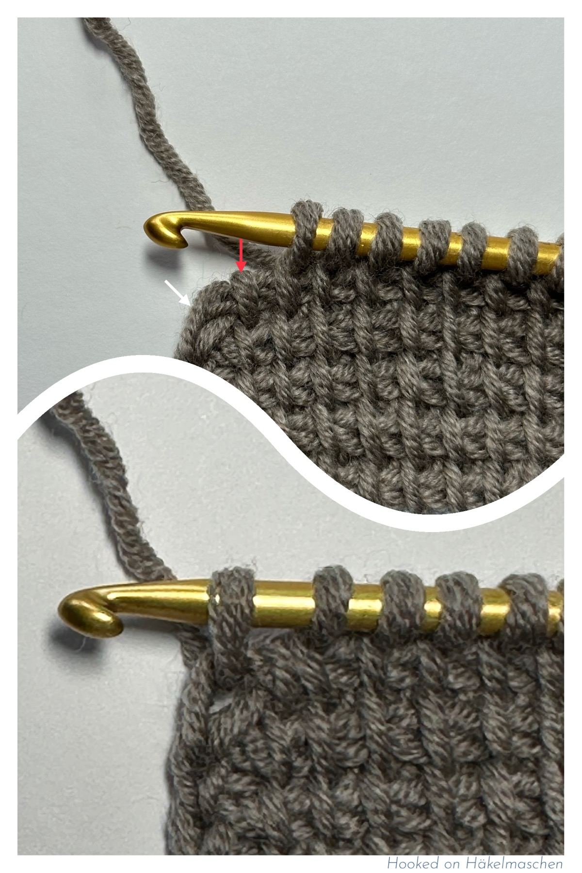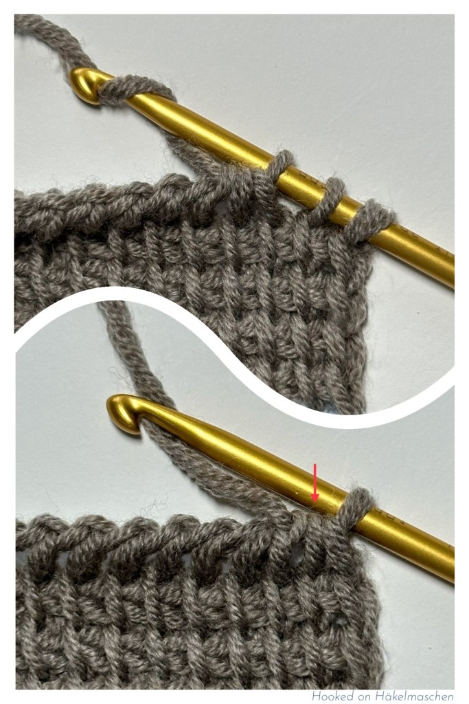 In the following forward pass, be careful when you reach the end of the row. The vertical bar of the decreased stitch is still visible (red arrow in the picture on the left). Skip this vertical bar and work the end stitch.