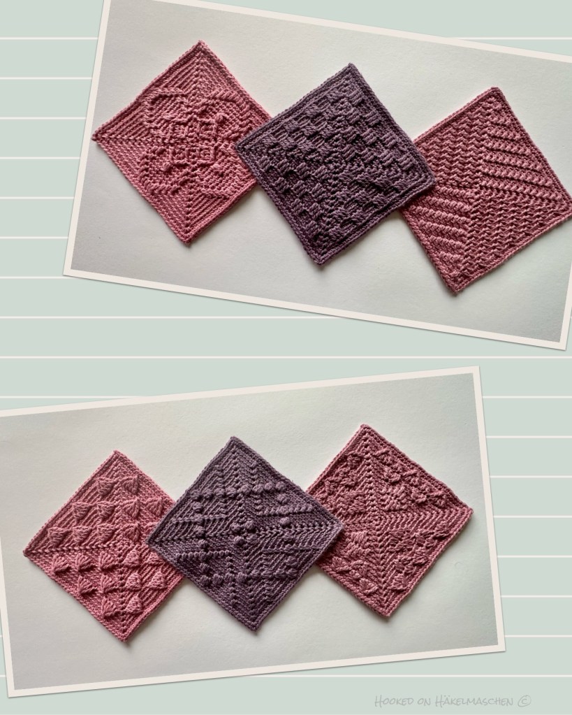 Carter Jude Square, Brood of Angels, Margaret Square, all made with Drops yarn