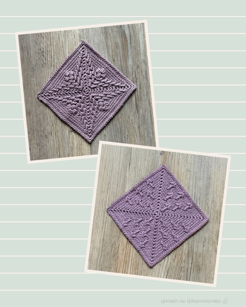 As you may know I have been unsure all the time which yarn to use. Pam’s squares are designed to use a cotton yarn in Aran weight. Depending on hook size – 4,5 or 5 mm hook – the finished size will be 11 or 12 inch – that’s about 28 respectively 30,5 cm.