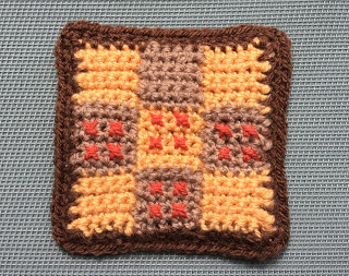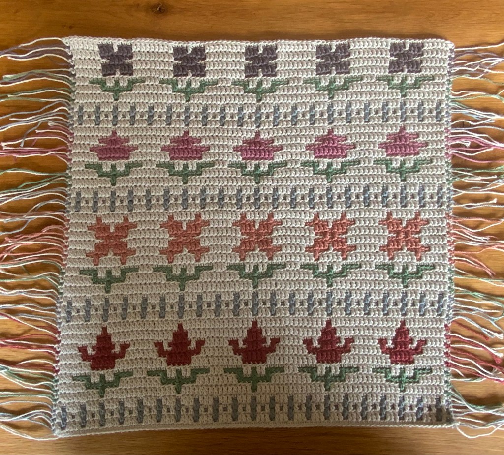 The flowers immediately reminded me of an old cross-stitch pattern. So I originally planned to make a small wallhanging. I decided to go with a cotton yarn to make it not too big and bulky. And I also was looking for some subdued colours to take into account the old cross-stitch pattern.