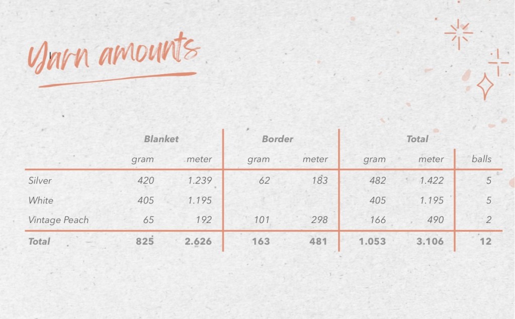 The size of finished blanket is 120 x 150 cm, using a 4. 0 mm hook. I needed 10 balls / 1,000 g of yarn. I had almost nothing left. So, with a different tension, it could be tight.
