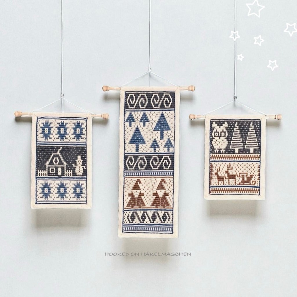 In 2022, Ana released Wintry Forest. The pattern was originally designed for a blanket similar in size to Winter Wonderland. However, when I saw it, I immediately had the idea of turning it into a wall decoration instead. Therefore I worked the pattern only over one repeat and divided it in three parts.