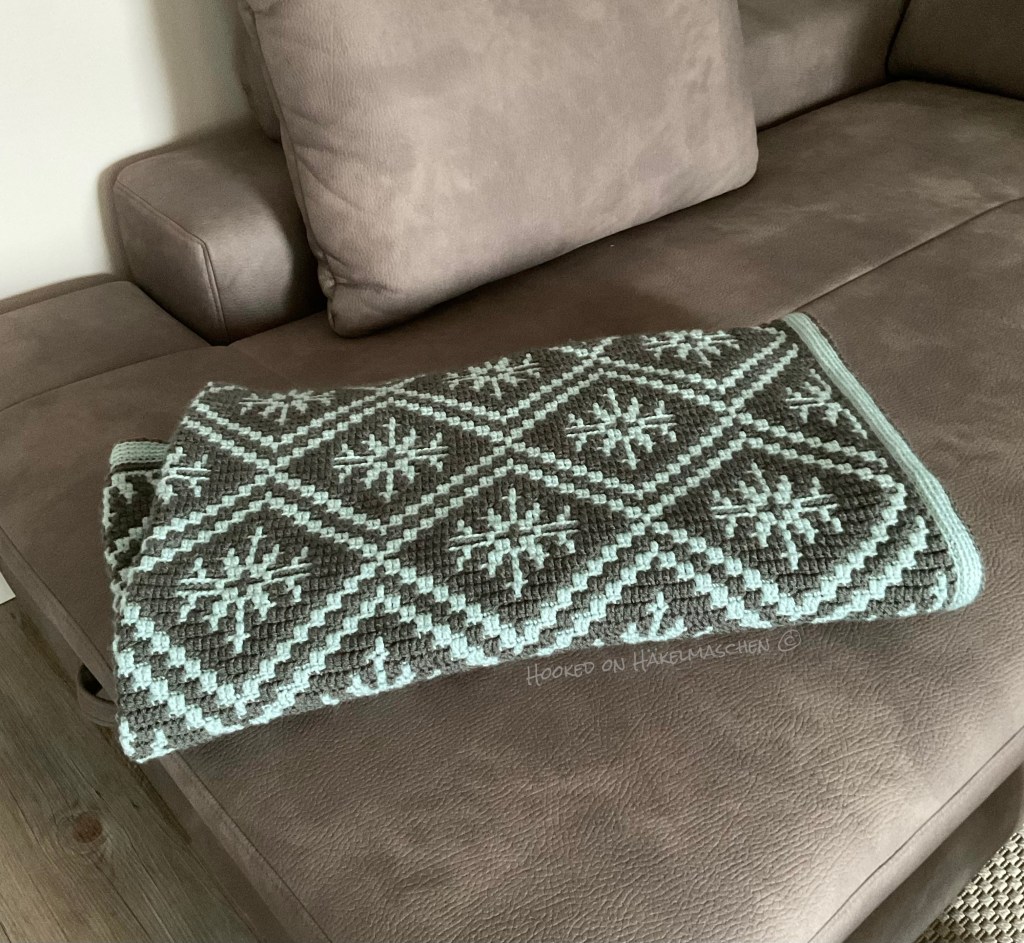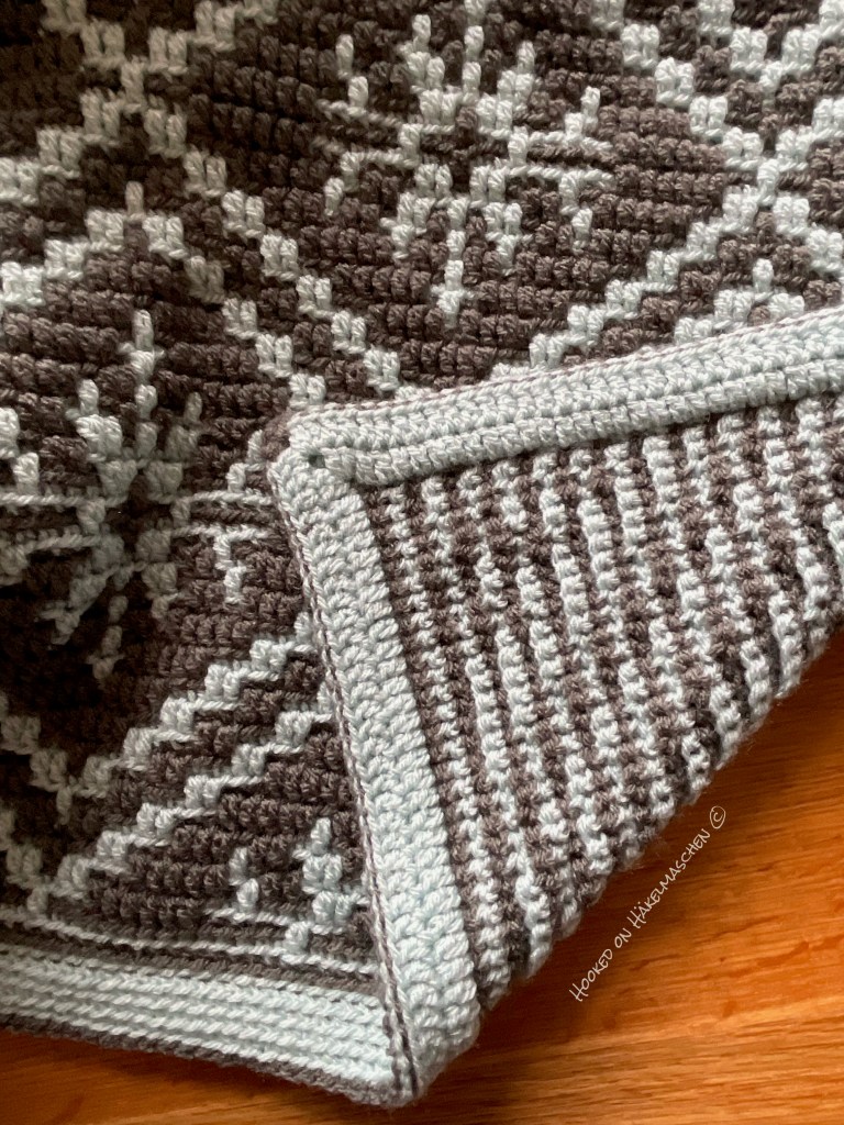 The original pattern is for a blanket made in Overlay Mosaic technique. Ana’s blanket is about 100 cm x 134 cm. With a repeat of only 24 stitches the size of the blanket is easy to adjust. As usual her pattern has written instructions in US terms, a chart and a lot of row by row pictures.