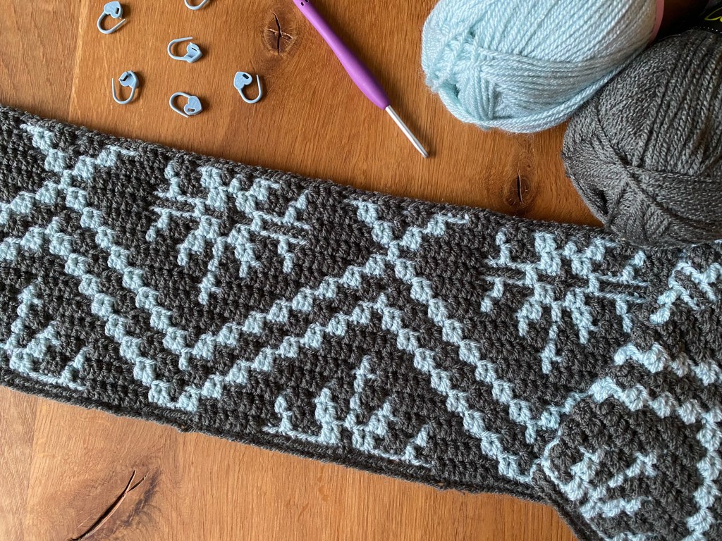 It is always hard to choose the right colours for a blanket. At least it is for me. It is very rare that I see a pattern and immediately know which colours I want to make it in. For Midnight Snowflakes I instantly had white combined with a grey tone in mind. White for the background with grey snowflakes! But something made me hesitate. I probably knew instinctively that hubby wouldn’t like it. And so it was!