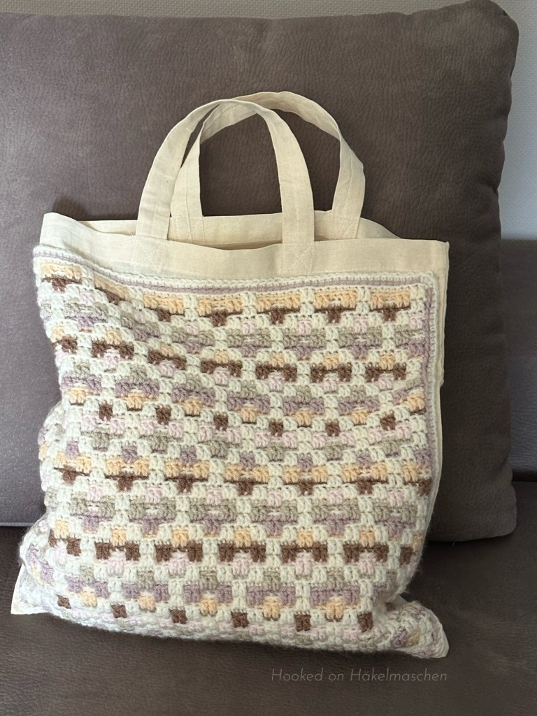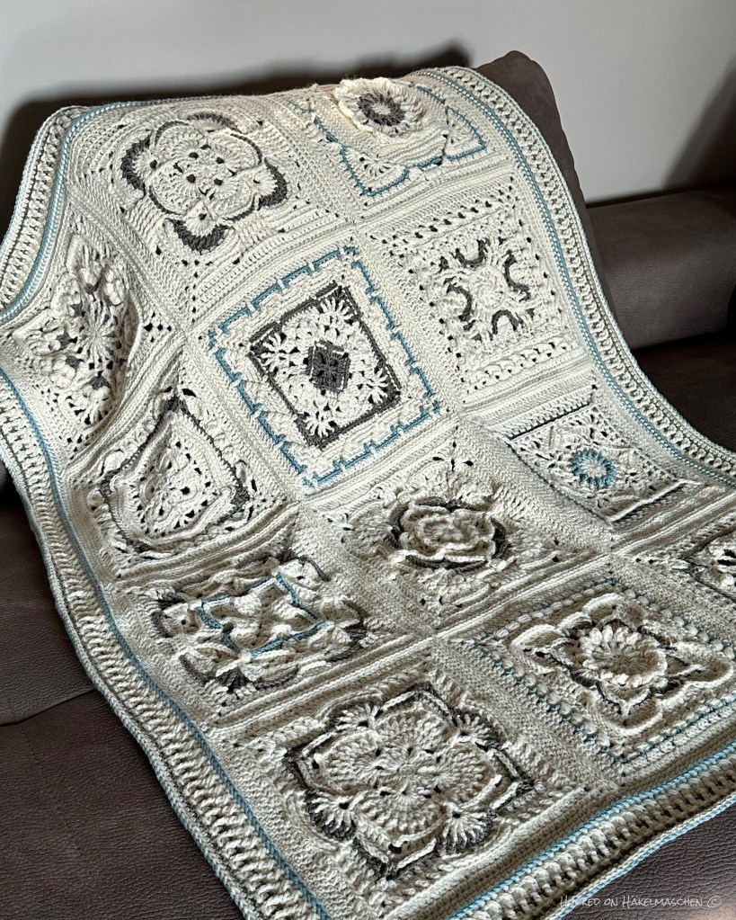 My finished square measures about 25 cm (10 in). It’s a little smaller than Pam’s sample simply because I used DK / light worsted yarn (#3), while she used Aran / worsted weight yarn (#4).