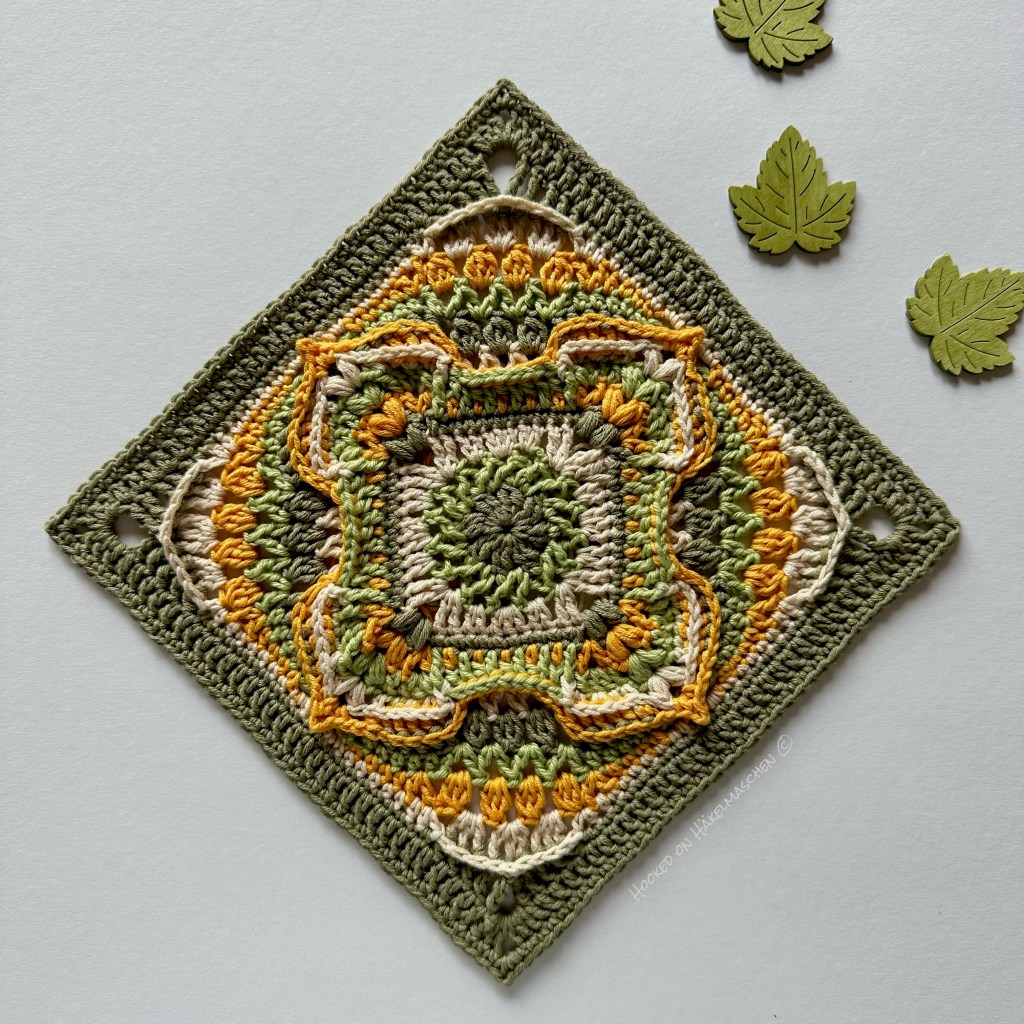 First I was not sure, if the two green yarns would work together but I am very happy with the result. Although, the square also looks great in a single colour!