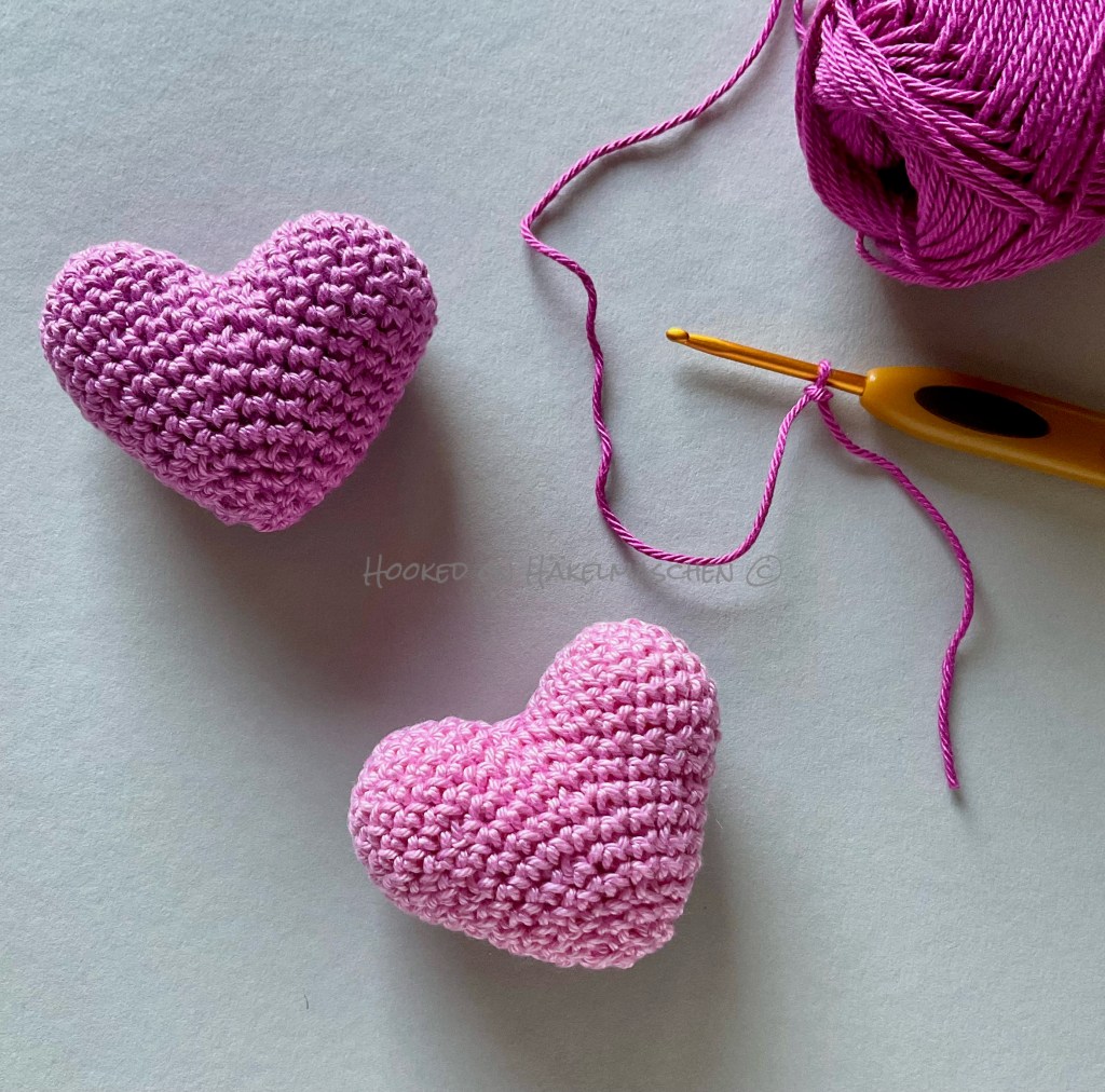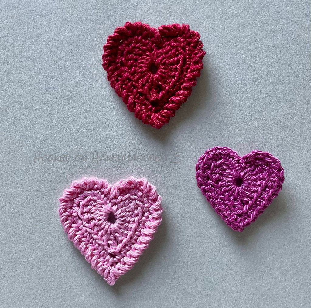 My small hearts are made with Cotton sport weight yarn and my 3,00 mm Clover Amour hook. They measure about 5 cm / 2 inch.