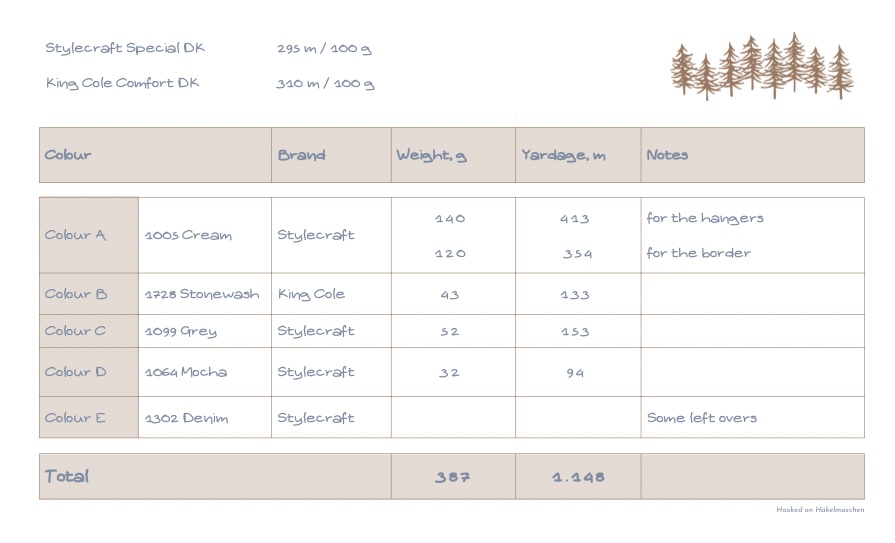 Cream, Mocha, Grey and a little bit of Denim – all from Stylecraft Special DK and Stonewash from King Cole Comfort DK (that‘s the lovely blue on the upper left)